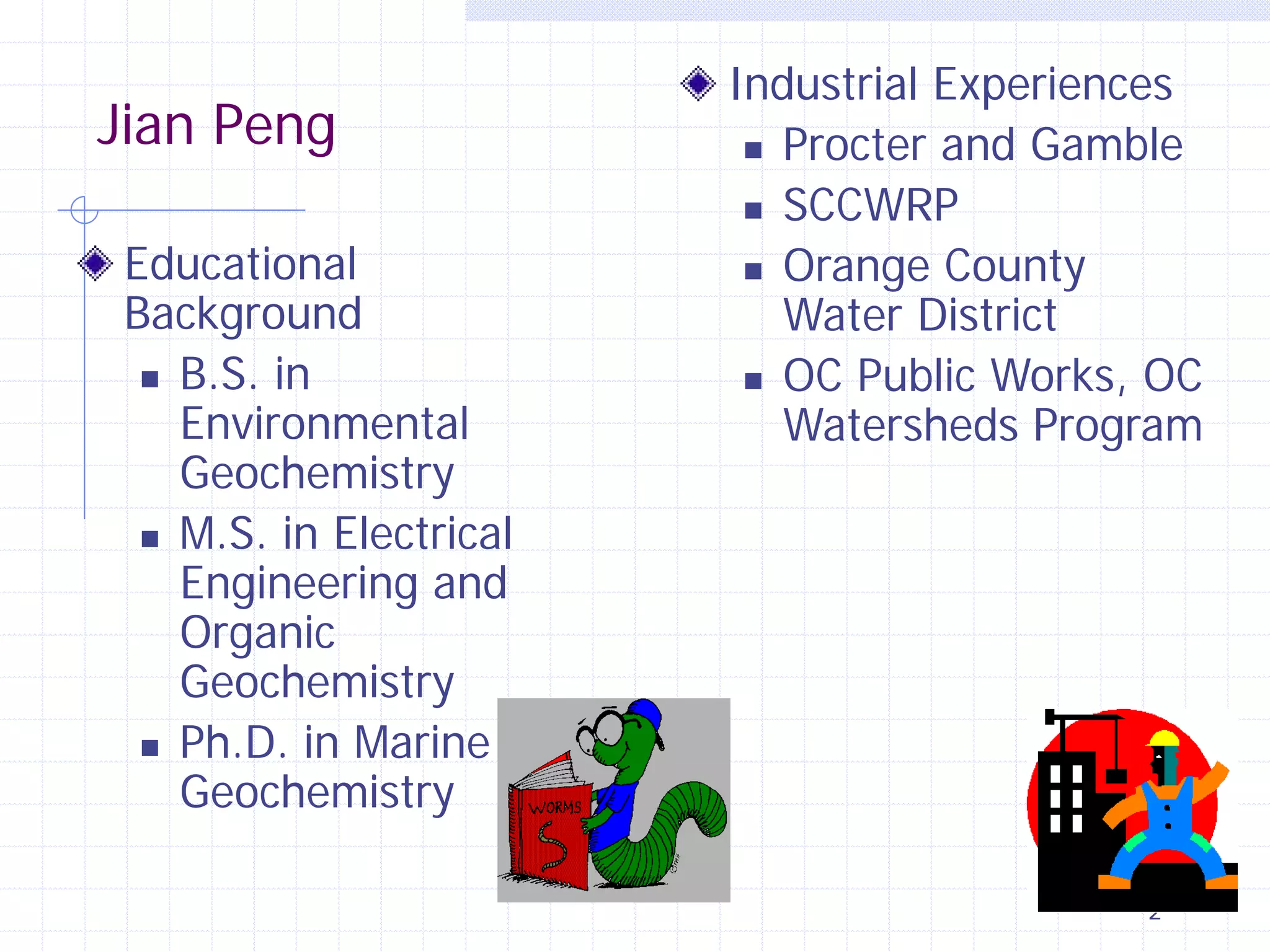 This document provides an overview of CE 441 - Introduction to Environmental Engineering, taught by Dr. Jian Peng at California State University, Fullerton. The course covers fundamental concepts in environmental engineering, including water and wastewater treatment processes, air pollution control, and environmental regulations. It aims to help students understand key environmental topics and prepare for engineering licensing exams. The document outlines the course goals, schedule, assignments, grading policy, and guest speakers.
