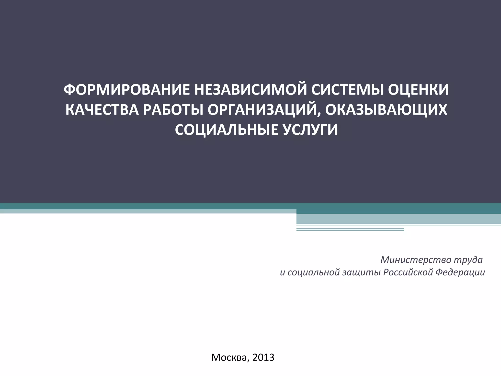 Документ описывает формирование независимой системы оценки качества работы организаций, оказывающих социальные услуги в России, с целью повышения качества и доступности таких услуг. Установлены цели, объекты и группы показателей оценки, а также механизмы реализации системы с участием граждан и общественных организаций. Ожидается, что результаты оценки будут использоваться для приема обоснованных решений потребителями и улучшения деятельности организаций.