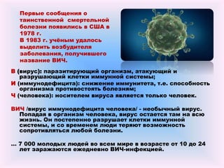 Документ подробно описывает вирус иммунодефицита человека (ВИЧ), его воздействие на иммунную систему и этапы развития заболевания, включая СПИД. Приведены статистические данные о количестве инфицированных в разных регионах, факторы передачи вируса и группы риска, а также ответственность за заражение. Также документ включает гипотезы о происхождении вируса, международные мероприятия и символику, связанные с ВИЧ/СПИДом.