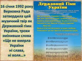 Гімн України написаний більше століття тому поетом В. Чубинським і композитором М. Вербицьким. Довгий час він був під забороною.