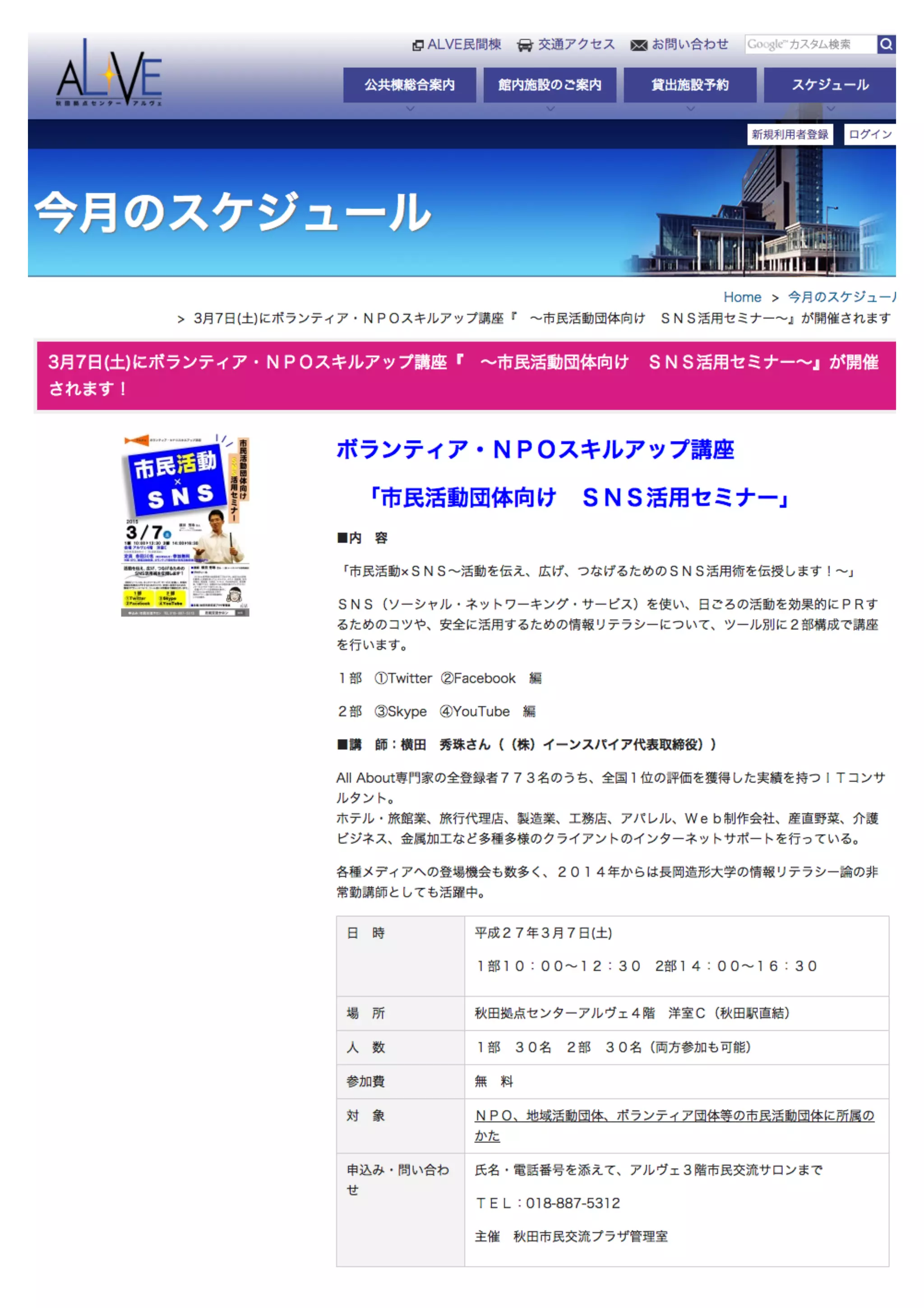 ボランティア・NPOスキルアップ講座「市民活動団体向けSNS活用セミナー」(秋田県)秋田市民交流プラザ管理室