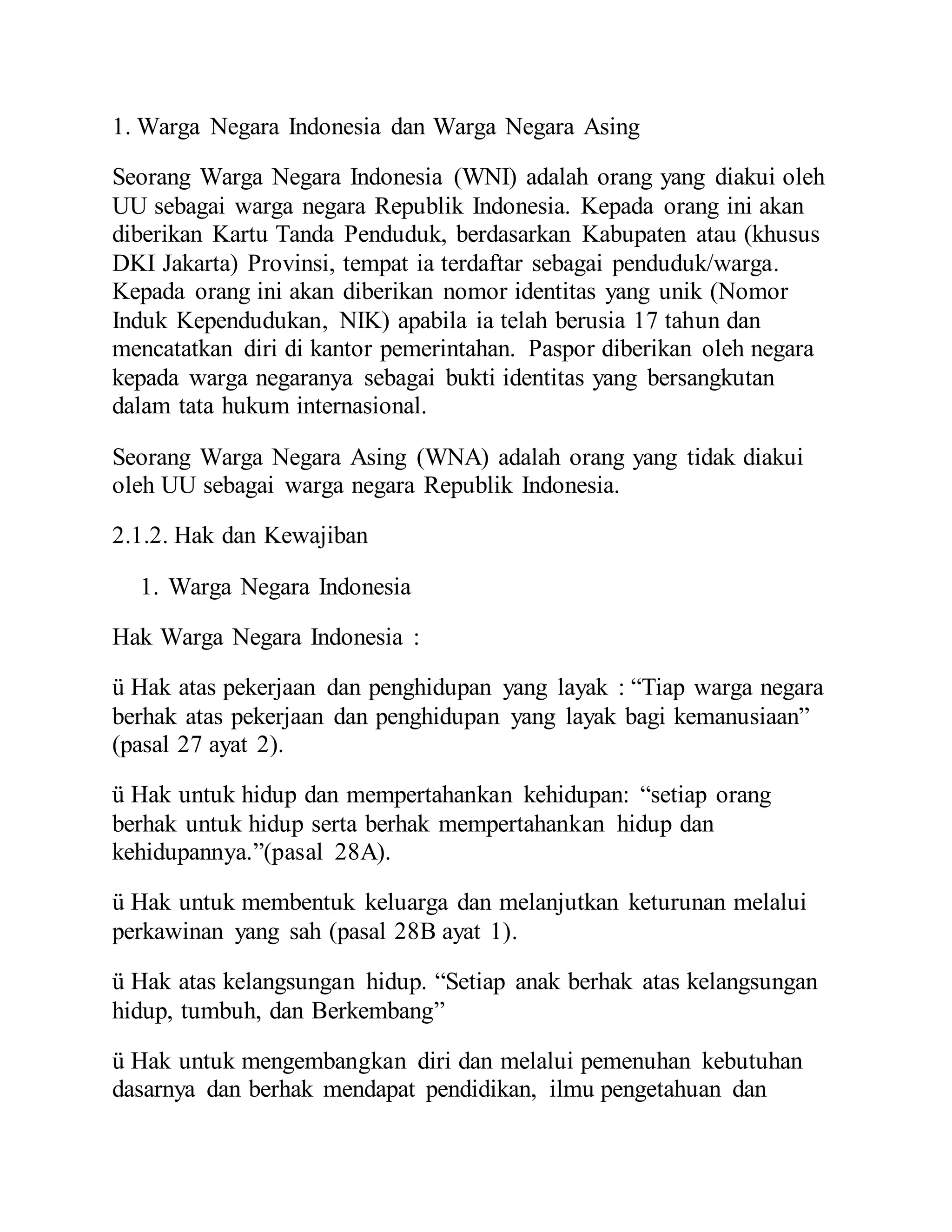 Dokumen ini membahas tentang status dan hak-hak warga negara Indonesia (WNI) dan warga negara asing (WNA) serta kewajiban mereka berdasarkan undang-undang negara. WNI memiliki hak dan kewajiban yang diatur dalam berbagai pasal, sementara WNA mendapatkan perlindungan namun tidak memiliki hak untuk berpartisipasi dalam jabatan publik. Selain itu, dokumen mencakup berbagai undang-undang yang mengatur kewarganegaraan dan perubahan-perubahannya dari waktu ke waktu.