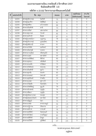 วิเคราะห์ 1 02593 เด็กหญิงธิดาภรณ์ ใจภักดี 75 3.5 3 3 2 02594 เด็กหญิงญาธิชา โชติพันธ์ 81 4 3 3 3 02595 เด็กหญิงศศิธร แก้วงามสอง 84 4 3 3 4 02596 เด็กชายจีระศักดิ์ สาลี 73 3 3 3 5 02597 เด็กชายวสันต์ เสยกระโทก 84 4 3 3 6 02598 เด็กชายศุภกรณ์ วังวงค์ 82 4 3 3 7 02599 เด็กชายอภิชาติ สีแสด 87 4 3 3 8 02600 เด็กหญิงเกตน์นิภา บุญหาญ 78 3.5 3 3 9 02601 เด็กหญิงจิราภรณ์ ภูจอมจิตร 81 4 3 3 10 02602 เด็กหญิงพัชราณี ดวงตา 81 4 3 3 11 02603 เด็กชายธวัชชัย ผลจันทร์ 81 4 3 3 12 02604 เด็กชายนันทวุฒิ นวลจร 84 4 3 3 13 02605 เด็กชายภานุวัฒน์ เชื้อคนแข็ง 52 ร 2 2 14 02606 เด็กชายวรุตย์ สลางสิงห์ 69 2.5 3 3 15 02607 เด็กชายระพีพัฒน์ พิทักษ์ 80 4 3 3 16 02608 เด็กชายยุทธนา เพ็งพิมพ์ 75 3.5 3 3 17 02609 เด็กชายธนนชัย ทวีพัฒน์ 75 3.5 3 3 18 02610 เด็กชายกิตติพงษ์ ทองเกตุ 68 2.5 3 3 19 02611 เด็กชายจีระศักดิ์ ชูแก้ว 74 3 3 3 20 02612 เด็กชายศุภชัย ทองคา 85 4 3 3 21 02613 เด็กชายธนพนธ์ โคตวงศ์ 65 2.5 3 3 22 02614 เด็กชายสุทธิพงศ์ ขาพลับ 59 ร 2 2 23 02615 เด็กชายนวพล สุขาวาปี 9 ร 2 2 24 02616 เด็กชายวิวัฒชัย จันทร์เติบ 76 3.5 3 3 25 02617 เด็กชายกิตติพิชญ์ ชูญาติ 74 3 3 3 26 02618 เด็กชายจักรพงษ์ บุญอุ้ม 76 3.5 3 3 27 02619 เด็กชายพัฒนา บุญอุ้ม 74 3 3 3 28 02620 เด็กหญิงอัจฉราภรณ์ ทองสุข 77 3.5 3 3 29 02621 เด็กหญิงพลอยวรินทร์ ผดาวัลย์ 83 4 3 3 30 02622 เด็กชายณัฐภูมิ นิลา 73 3 3 3 31 02623 เด็กชายวรพล สาธรราษฎร์ 56 1.5 2 2 32 02624 เด็กชายปฏิภาณ เงียมงาม 57 1.5 2 2 33 02626 เด็กชายอติราช ราชวงศ์ 74 3 3 3 34 02627 เด็กชายอภิสิทธิ์ จันทองแท้ 78 3.5 3 3 35 02628 เด็กชายถิรวัฒน์ นามปัญญา 83 4 3 3 36 02629 เด็กชายอดิศักดิ์ มิ่งมูล 83 4 3 3 37 02630 เด็กชายอภิสิทธิ์ ภูมิพัฒน์ 67 2.5 3 3 ลงชื่อ................................................................. (นางสาวจารุวรรณ จันทราภรณ์) ครูผู้สอน ชั้นมัธยมศึกษาปีที่ 1/2 รหัสวิชา ง 21102 วิชาการงานอาชีพและเทคโนโลยี ที่ เลขประจาตัว ชื่อ - สกุล คะแนน เกรด แบบรายงานผลการเรียน ภาคเรียนที่ 2 ปีการศึกษา 2557