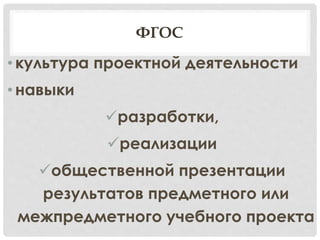 Документ анализирует метод проектов как важную технологию в образовании, рассматривая его влияние на развитие навыков учащихся и проектной деятельности. Он описывает этапы реализации учебных проектов, включая постановку задач, сбор и оформление материала, а также презентацию результатов. Важное внимание уделяется формулировке проблем и организации совместной работы студентов для достижения поставленных образовательных целей.