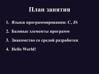 Документ представляет план занятия по основам программирования, включая языки C и JavaScript, базовые элементы программ и процессоры. Он объясняет структуру программ, компиляцию, работу с переменными и операторами, а также предоставляет примеры кода 'hello world!' для обоих языков. В конце указаны домашние задания по установке инструментов и выполнению вычислений по заданным формулам.