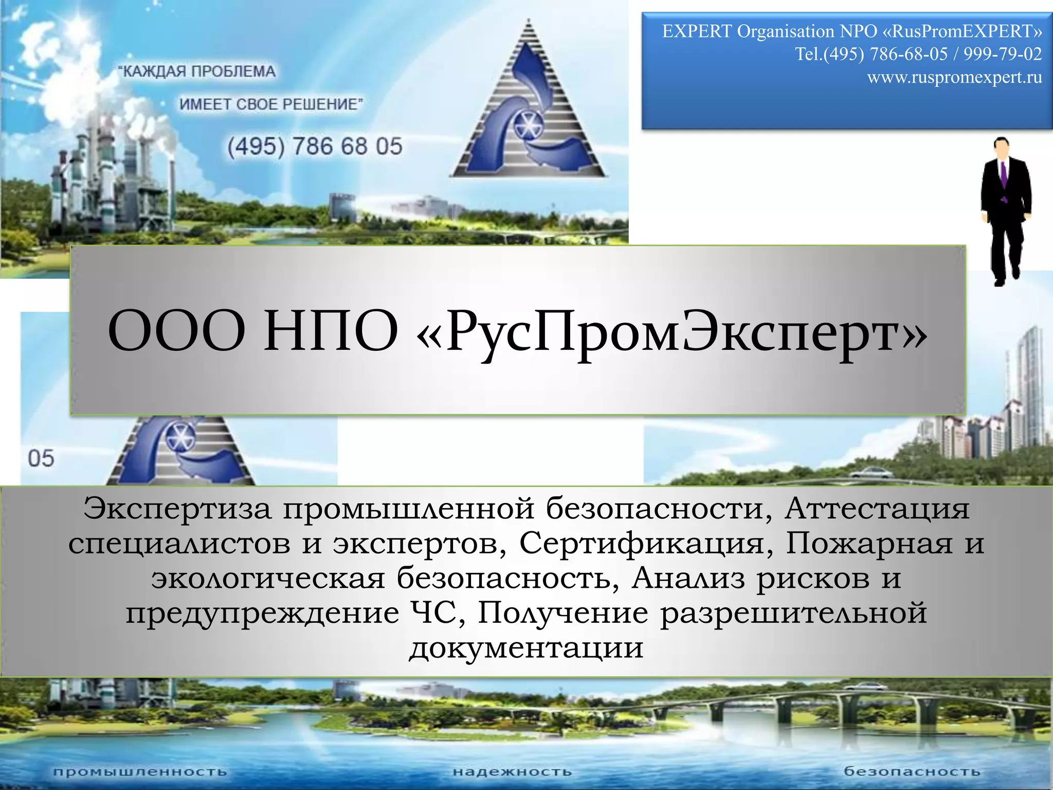 Документ описывает услуги НПО «Руспромэксперт» в области экспертизы промышленной безопасности, включая аттестацию специалистов, сертификацию и анализ рисков. Освещаются основные направления работ, такие как экспертиза проектной документации, технических устройств и зданий, а также деклараций промышленной безопасности для опасных производственных объектов. Организация предоставляет информацию о своих контактах и условиях обслуживания.