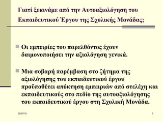 Γιατί ξεκινάμε απότην Αυτοαξιολόγηση του Εκπαιδευτικού Έργου της Σχολικής Μονάδας; Οι εμπειρίες του παρελθόντος έχουν δαιμονοποιήσει την αξιολόγηση γενικά. Μια σοβαρή παρέμβαση στο ζήτημα της αξιολόγησης του εκπαιδευτικού έργου προϋποθέτει απόκτηση εμπειριών από στελέχη και εκπαιδευτικούς στο πεδίο της αυτοαξιολόγησης του εκπαιδευτικού έργου στη Σχολική Μονάδα.