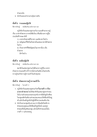 นักเรียนตอบคําถามกระตุ้นความคิด 2. นักเรียนร่วมกันสรุปความรู้เรือง มาตราตั วสะกด ตรวจแบบทดสอบก่อนเรียน หน่วยการเรียนรู้ ที 1 แบบทดสอบก่อนเรียน หน่วยการเรียนรู้ ที 1 ตรวจใบงานที 1.1 ใบงานที 1.1 ร้อยละ 60 ผ่านเกณฑ์ สังเกตพฤติกรรมการทํางานรายบุคคล แบบสังเกตพฤติกรรมการทํางาน รายบุคคล ระดับคุณภาพ2 ผ่าน เกณฑ์ สังเกตพฤติกรรมการทํางานกลุ่ม แบบสังเกตพฤติกรรมการทํางานกลุ่ม ระดับคุณภาพ2 ผ่าน เกณฑ์ สังเกตการใฝ่เรียนรู้ มีความรับผิดชอบ และมุ่งมันใ นการทํ างาน แบบประเมินคุณลักษณะอันพึงประสงค์ ระดับคุณภาพ2 ผ่าน เกณฑ์ สือ/แหล่งการเรียนรู้ 8.1 สือการเรี ยนรู ้ 1) หนังสือเรียน ภาษาไทย: หลักภาษาและการใช้ภาษา ป.4 2) เกมนักสืบภาษาตามหาตัวสะกด 3) ใบงานที 1.1 เรือง มาตราตั วสะกด 8.2 แหล่งการเรียนรู้
