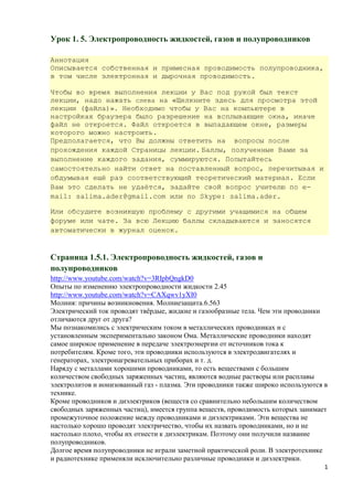 Документ описывает электропроводность жидкостей, газов и полупроводников, выделяя их основные характеристики, такие как электронная и дырочная проводимость. Объясняется, что полупроводники, такие как кремний и германий, имеют уникальные свойства, зависящие от температуры и наличия примесей, что позволяет им использоваться в радиотехнике и вычислительных машинах. Также рассматриваются методы увеличения проводимости полупроводников с помощью добавления донорных и акцепторных примесей.