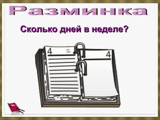 Документ содержит ряд вопросов и задач, связанных с основными понятиями, такими как дни недели, месяцы года, правила дорожного движения и элементарные арифметические операции. Также представлены примеры обратного и прямого счёта. В конце текста включена физкультминутка с описанием движений.