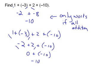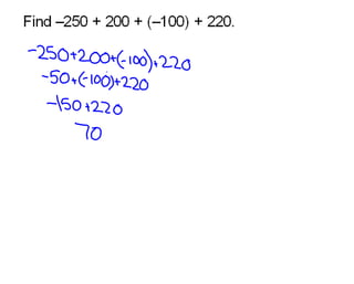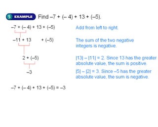 The document discusses rules for adding integers with the same or different signs. When adding integers with the same sign, add the numbers and keep the sign. When adding integers with different signs, subtract the absolute values and keep the sign of the integer with the greater absolute value. It provides examples of applying these rules to expressions involving integers.