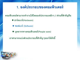 ware) คอมพิวเตอร์สามารถทางานได้โดยองค์ประกอบหลักๆ 3 ส่วนที่สาคัญคือ ● ซอฟแวร์ (Software) เราสามารถแบ่งส่วนประกอบที่สาคัญๆออกได้ดังนี้