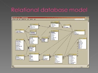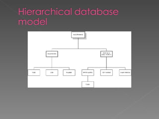 The document discusses databases, database management systems, database models, and database concepts. It provides definitions and examples of key terms related to databases including fields, records, files, entities, attributes, primary keys, and relationships. It also summarizes different database models like hierarchical, network, relational, and object databases as well as database types like XML databases.