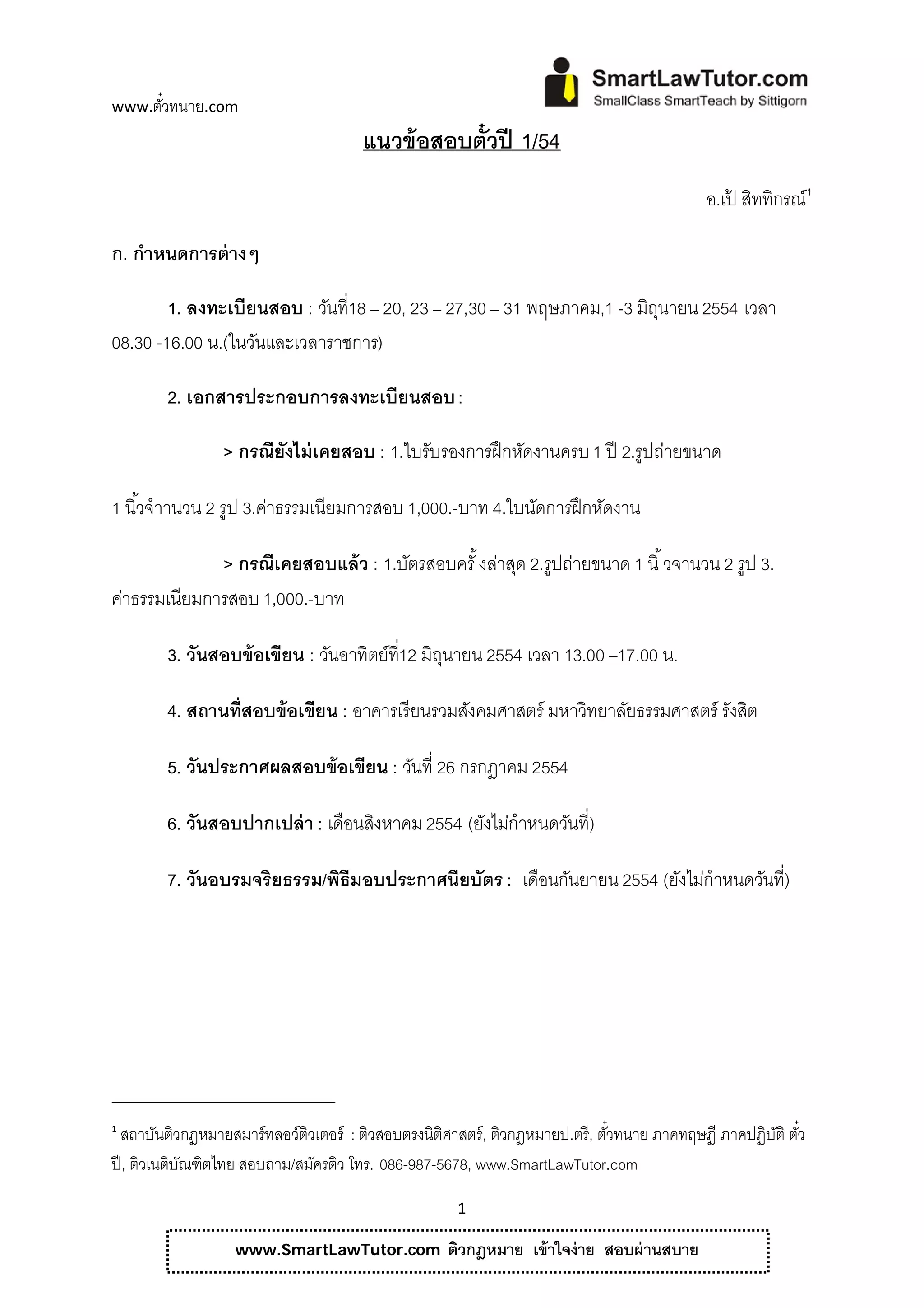 ั๋ แนวข้ อสอบตั๋วปี 1/54 อ.เป สิททิกรณ์ 1 ้ 0 ก. กําหนดการต่ างๆ 1. ลงทะเบียนสอบ : วนที่18 – 20, 23 – 27,30 – 31 พฤษภาคม,1 -3 มิถนายน 2554 เวลา ั ุ 08.30 -16.00 น.(ในวันและเวลาราชการ) 2. เอกสารประกอบการลงทะเบียนสอบ : > กรณียังไม่เคยสอบ : 1.ใบรับรองการฝึ กหัดงานครบ 1 ปี 2.รูปถ่ายขนาด 1 นิ ้วจําานวน 2 รูป 3.ค่าธรรมเนียมการสอบ 1,000.-บาท 4.ใบนดการฝึกหดงาน ั ั > กรณีเคยสอบแล้ว : 1.บัตรสอบครั ้ งลาสด 2.รูปถ่ายขนาด 1 นิ ้ วจานวน 2 รูป 3. ่ ุ ค่าธรรมเนียมการสอบ 1,000.-บาท 3. วันสอบข้ อเขียน : วนอาทิตย์ท12 มิถนายน 2554 เวลา 13.00 –17.00 น. ั ี่ ุ 4. สถานท่ สอบข้อเขียน : อาคารเรียนรวมสังคมศาสตร์ มหาวิทยาลัยธรรมศาสตร์ รังสิต ี 5. วันประกาศผลสอบข้ อเขียน : วนที่ 26 กรกฎาคม 2554 ั 6. วันสอบปากเปล่ า : เดือนสิงหาคม 2554 (ยงไมกําหนดวนที่) ั ่ ั 7. วันอบรมจริยธรรม/พิธีมอบประกาศนียบัตร : เดือนกันยายน 2554 (ยงไมกําหนดวนที่) ั ่ ั 1 สถาบันติวกฎหมายสมาร์ ทลอว์ติวเตอร์ : ติวสอบตรงนิติศาสตร์ , ติวกฎหมายป.ตรี, ตัวทนาย ภาคทฤษฎี ภาคปฏิบติ ตัว ๋ ั ๋ ปี , ติวเนติบณฑิตไทย สอบถาม/สมครติว โทร. 086-987-5678, www.SmartLawTutor.com ั ั 1 www.SmartLawTutor.com ติวกฎหมาย เข้ าใจง่ าย สอบผ่ านสบาย