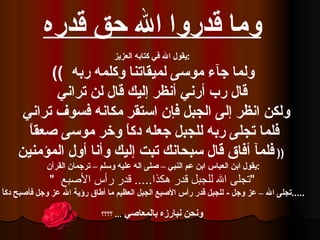 تناقش الوثيقة حول عظمة الله وقدرته، مستخدمة آيات من القرآن لإظهار عظمة الله وتجلياته، كما تحتوي على قصص قصيرة تعكس تدبر العباد في فهم قدرت الله وضرورة العبادة والرجوع إليه. تستعرض الوثيقة أيضًا أمثلة شعورية حول أهمية التوبة وذاكرة النفس للرجوع إلى الله.