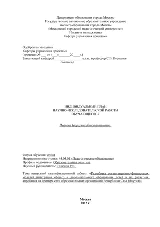 Документ представляет индивидуальный план научно-исследовательской работы студента по теме интеграции общего и дополнительного образования детей в Республике Саха (Якутия). Он охватывает проектирование региональной образовательной политики, организационно-финансовое моделирование и включает развернутый план выпускной квалификационной работы с методологическими аспектами и этапами выполнения. Актуальность темы обусловлена необходимостью улучшения доступа детей к дополнительным образовательным программам и устранения ведомственных барьеров.