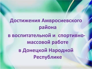 Документ освещает достижения образовательных учреждений Амвросиевского района в воспитательной и спортивной работе, с акцентом на патриотические мероприятия, творческие конкурсы и достижения учащихся на республиканском уровне. Среди упомянутых событий — проведение литературных гостинных, конкурсов творческих работ, олимпиад и фестивалей ораторского мастерства, на которых ученики и педагоги получили многочисленные награды. Учитываются достижения в области организации образовательного процесса и развитие патриотического воспитания среди молодежи.