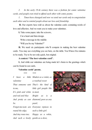 The document is a lesson plan for a St. Valentine's Day program aimed at teaching students about the holiday's history and traditions through songs, dances, poems, games and discussions. The plan includes segments where students learn about the origins of Valentine's Day and valentine cards, participate in contests to make cards and dance, and express their feelings through compliments and sketches. The program concludes with a dance party and encourages spreading love, happiness and support for others.