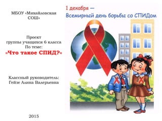 Документ представляет проект учащихся 6 класса о ВИЧ/СПИД, включая информацию о тестировании на ВИЧ, способы передачи инфекции и правила безопасного поведения. Учащимся напоминается, что спид неизлечим, и единственным способом защиты является соблюдение предосторожностей. Проект включает задания для учащихся и обсуждения о безопасном поведении.