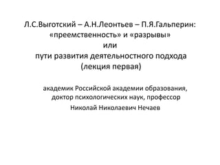 Документ рассматривает развитие деятельностного подхода в психологии, сосредотачиваясь на концепциях Л.С. Выготского и А.Н. Леонтьева о предмете и смысловом значении знаков в процессе психического развития. Основное внимание уделяется различию между непосредственными и опосредованными социальными взаимодействиями, а также тому, как высшие психические функции проявляются в коллективном и индивидуальном поведении. Взгляды ученых акцентируют внимание на важности знаков как средств внутренней деятельности и их роли в организации психологических операций.