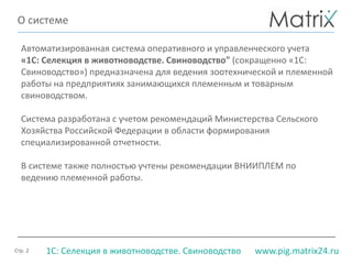 Документ описывает автоматизированную систему учета '1С: Селекция в животноводстве. Свиноводство', предназначенную для эффективного управления зоотехнической и племенной деятельностью в свиноводстве. Система предлагает широкие возможности, включая учет животных, кормов и ветеринарных препаратов, а также аналитическую отчетность и интеграцию с другими системами. Основные преимущества включают снижение затрат, повышение операционной эффективности и возможность удаленного доступа.