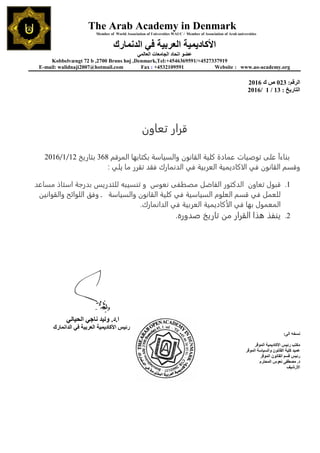 الأكاديمية العربية في الدنمارك هي عضو في الاتحاد العالمي للجامعات وعضو في اتحاد الجامعات العربية. الوثيقة تتعلق بتوجيهات أكاديمية على قضايا السياسة العامة وفقًا للممارسات الأكاديمية. تم إصدار الوثيقة بتاريخ 13 يناير 2016 وتتعلق بأنشطة أكاديمية في مجالات السياسة والعلم.