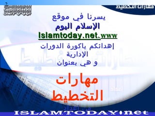 يتناول الوثيقة مهارات التخطيط وأهميتها في تحقيق الأهداف وتقليل المخاطر. يشدد على ضرورة التحليل والتفكير الاستراتيجي لتحقيق النجاح، ويطرح أسئلة تساعد الأفراد على تقييم وضعهم الحالي وطموحاتهم المستقبلية. كما يناقش أهمية التخطيط كأسلوب أساسي وليس خياراً إضافياً في إدارة الوقت والموارد.