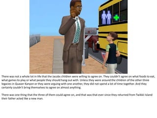 This document provides an update on the lives of several sim families in Quaver Canyon. It describes David Jacobs having a dream where his deceased wife tells him to move on, hinting at his growing feelings for his employee Sarah. It then recaps several birthday events where the children age up, including Amelia becoming the first "perma-plat" sim of her generation. The document concludes with David asking Sarah on a date but she declines as he is still married, and Quinn seeing the matchmaker leave something outside her home.