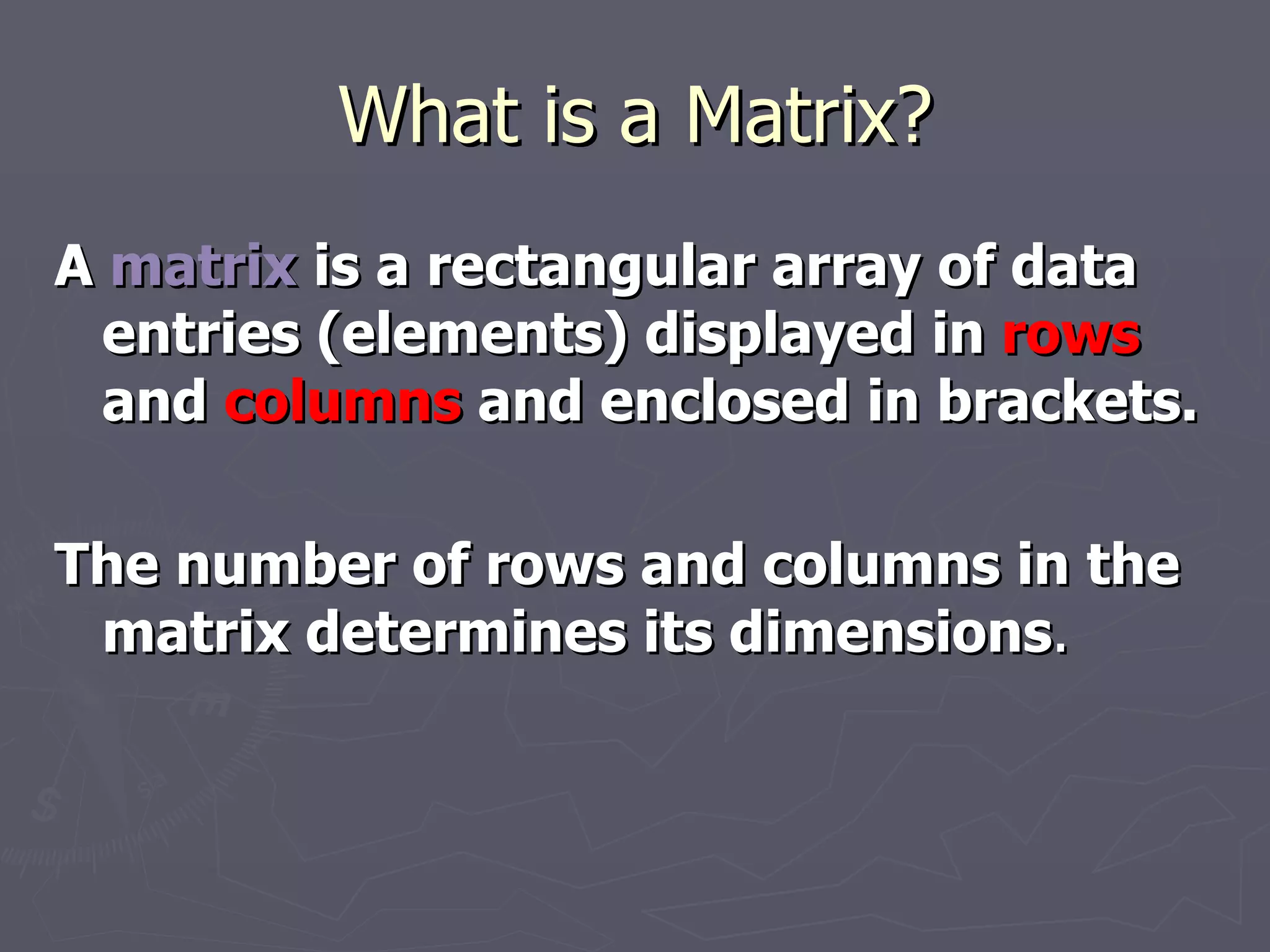 The document provides information about matrices including how to define them, add and subtract them, and examples of performing these operations. A matrix is defined as a rectangular array of numbers arranged in rows and columns, where the number of rows and columns determines its dimensions. The document also explains how to name specific elements within a matrix using row and column notation.