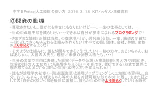 中学$Prolog(人工知能)の使い方 2016.3.18 KITハッカソン準備資料 ⓪開発の動機 ・尊敬されたいし、豊かにも幸せにもなりたいけど・・・、一生の仕事としては、 ・世の中の理不尽を減らしたい・・・できれば自分が夢中になれるプログラミングで! ・さまざまな論理(正論は当然。少数意見も)が、選択肢(仮説、一案、筋道の明確な 一理)としてきっちり伝わる仕組みを作りたい(すべての国、団体、会社、仲間、家族 をより明るくするような) ・そのような仕組みに、誰もが関与できるようにしたい(一般の方々、おじいちゃん、お ばあちゃん、大昔の大先生、理想/未来の仮想人格たち、・・・) ・自分の言葉で自由に表現した事実(データや仮説)と推論規則(考え方や理論)を、 世界の誰(の人工知能)にも影響を与えうる(=引用でき、敷衍できる)形式で世界に 解き放てるようにする(誰もが世界(の考え方)を変えられる)! ・誰もが論理学の初歩(一階述語論理)と論理プログラミング(人工知能)を習得し、自 分、おじいちゃん、おばあちゃん等の人格を対話可能な形でネットに残し、生きた証と しての(自分の信じた)知を後世に蓄積し、誰もが世の中をより明るくしていける時代