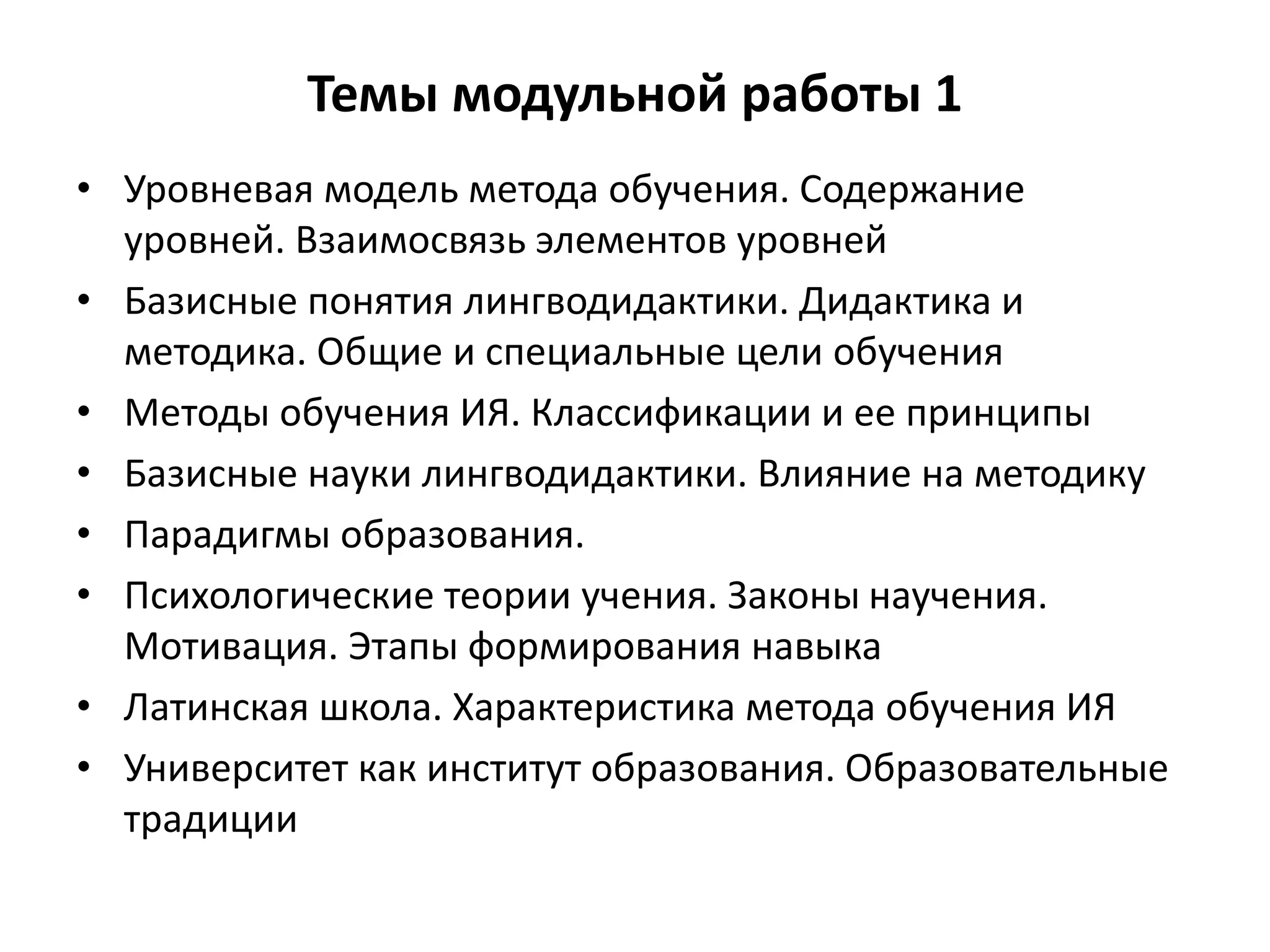 Документ охватывает ключевые темы методологии обучения, включая уровневую модель и взаимосвязь элементов лингводидактики. Рассматриваются психологические теории научения, методы обучения и их классификации, а также подходы к формированию навыков. Обсуждаются также парадигмы образования и критерии элитарности в образовательной системе.