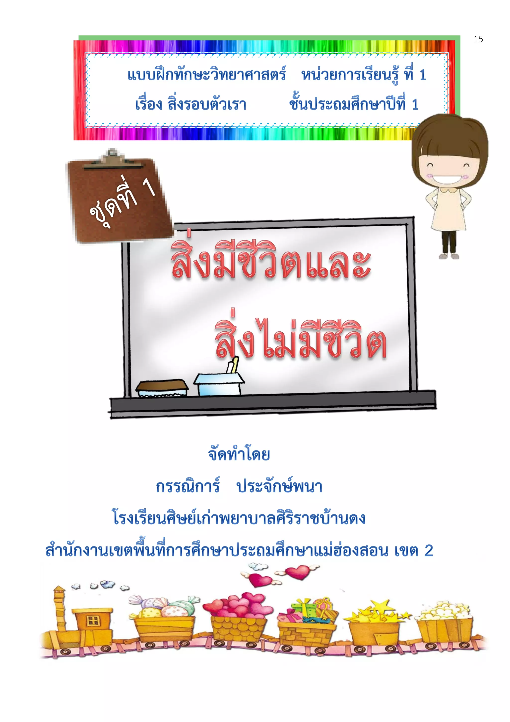 ชุด ให้นักเรียนปฏิบัติตาม คาแนะนาของแบบฝึกทักษะกระบวนการทางวิทยาศาสตร์แต่ละชุด แบบฝึกทักษะวิทยาศาสตร์ เรื่อง สิ่งรอบตัวเรา ชั้นประถมศึกษาปีที่ 1 ผู้จัดทาได้ ศึกษาและวิเคราะห์เนื้อหาจากหนังสือเรียน กลุ่มสาระการเรียนรู้วิทยาศาสตร์ ชั้น ประถมศึกษาปีที่ 1 ตามหลักสูตรแกนกลางการศึกษาขั้นพื้นฐานพุทธศักราช 2551 ของ กรมวิชาการ กระทรวงศึกษาธิการ สานักงานส่งเสริมวิทยาศาสตร์และเทคโนโลยี หนังสือ สื่อการเรียนรู้สานักพิมพ์วัฒนาพานิช ชุดกิจกรรมพัฒนาการคิดวิเคราะห์วิทยาศาสตร์ ป.1 ของสถาบันพัฒนาคุณภาพวิชาการ และงานวิจัยที่เกี่ยวกับการจัดทาชุดกิจกรรม วิทยาศาสตร์ ซึ่งจัดทาชุดกิจกรรมวิทยาศาสตร์นี้ เพื่อใช้เป็นเครื่องมือประกอบการสอน เสริม ฝึกทักษะทางวิทยาศาสตร์ ทักษะการจาแนก และการเรียนรู้ เข้าใจเกี่ยวกับสิ่งที่อยู่ รอบตัว จุดประสงค์ของการฝึก 1. เพื่อให้นักเรียน รู้จักสิ่งต่าง ๆ ที่อยู่รอบตัว สามารถลักษณะสาคัญของสิ่งมีชีวิต และสิ่งไม่มีชีวิตได้ 2. เพื่อให้นักเรียนเปรียบเทียบความแตกต่างระหว่างสิ่งมีชีวิตและสิ่งไม่มีชีวิตได 3. เพื่อให้นักเรียนสามารถ สาระการเรียนรู้ สิ่งรอบตัวเรา ประกอบด้วย สิ่งมีชีวิตและสิ่งไม่มีชีวิต ตัวชี้วัด ว 1.1 ป.1/1 เปรียบเทียบความแตกต่างระหว่างสิ่งมีชีวิตกับสิ่งไม่มีชีวิต