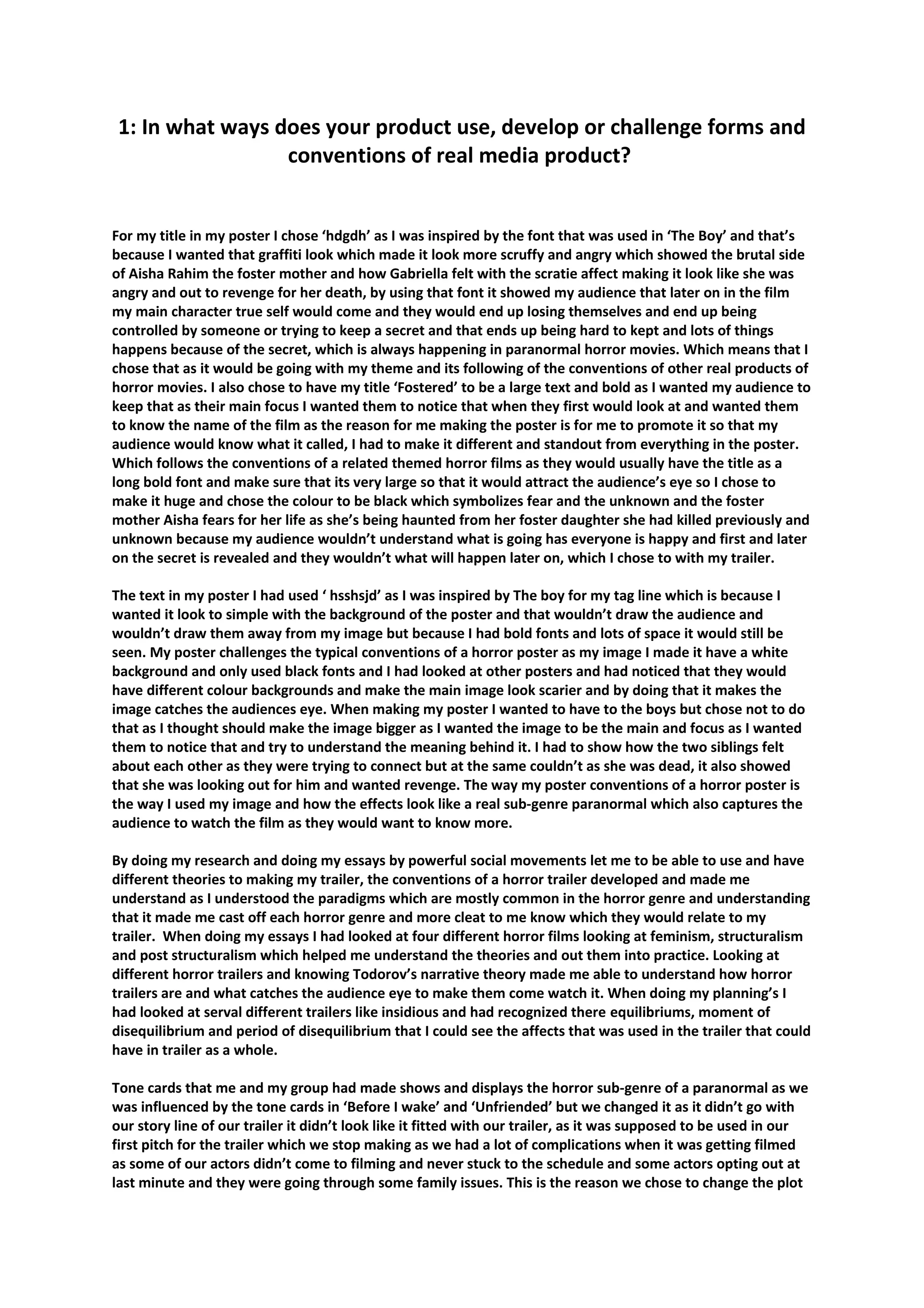 The document discusses the creation of a trailer, poster, and magazine cover for a horror film called "Fostered" about a foster mother who abuses and kills her foster children. The creator conducted research on horror conventions and audience preferences to inform their ancillary texts. Feedback from surveys and interviews showed that paranormal and psychological horror were popular genres and influenced changes to add more backstory for the abusive foster mother. The trailer, poster, and magazine work together to advertise the film and draw in the intended horror-fan audience while challenging some conventions through unconventional character roles and costumes.