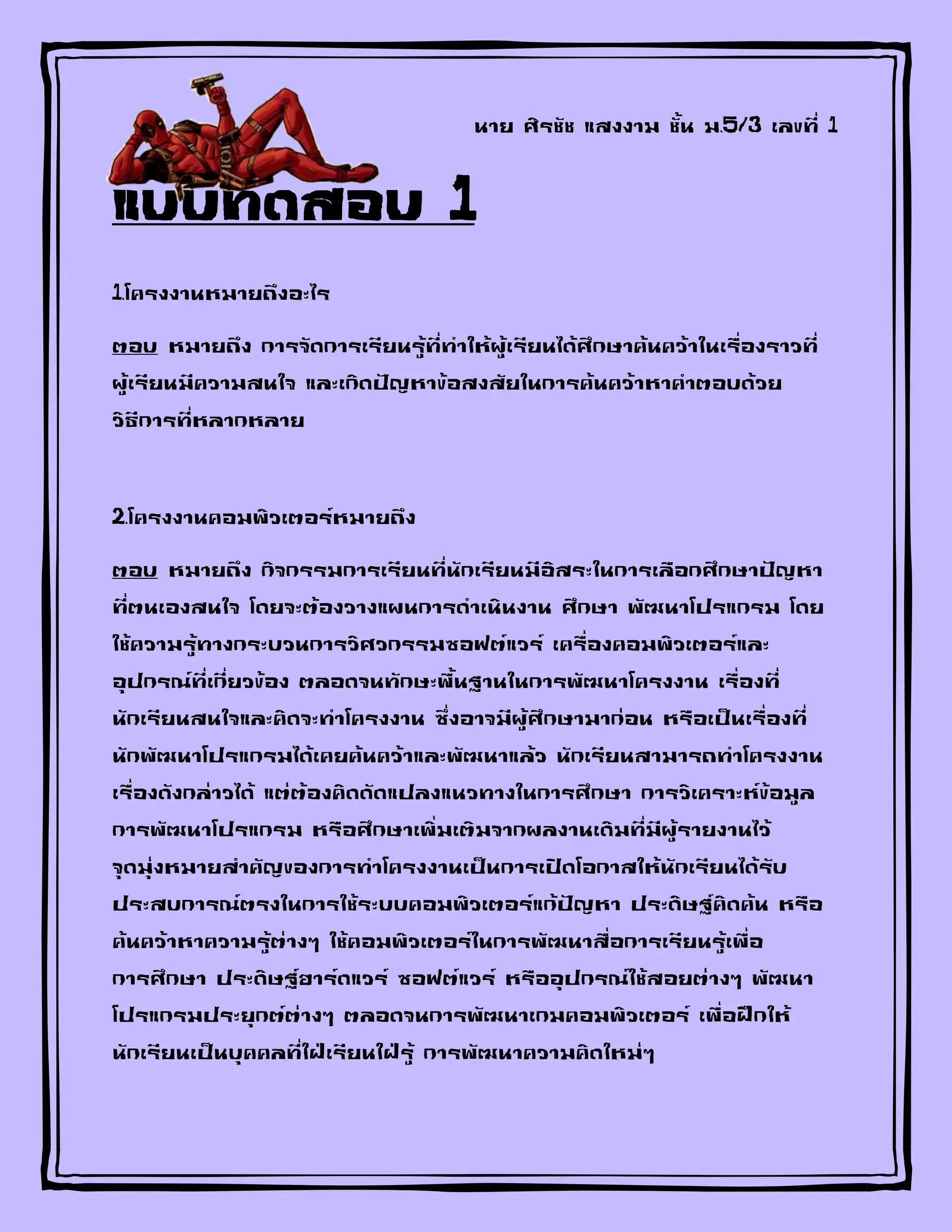 ชั้น ม.5/3 เลขที่ 1 แบบทดสอบ 1 1.โครงงานหมายถึงอะไร ตอบ หมายถึง การจัดการเรียนรู้ที่ทาให้ผู้เรียนได้ศึกษาค้นคว้าในเรื่องราวที่ ผู้เรียนมีความสนใจ และเกิดปัญหาข้อสงสัยในการค้นคว้าหาคาตอบด้วย วิธีการที่หลากหลาย 2.โครงงานคอมพิวเตอร์หมายถึง ตอบ หมายถึง กิจกรรมการเรียนที่นักเีรียนมีอิสระในการเลือกศึกษาปัญหา ที่ตนเองสนใจ โดยจะต้องวางแผนการดาเนินงาน ศึกษา พัฒนาโปรแกรม โดย ใช้ความรู้ทางกระบวนการวิศวกรรมซอฟต์แวร์ เครื่องคอมพิวเตอร์และ อุปกรณ์ที่เกี่ยวข้อง ตลอดจนทักษะพื้นฐานในการพัฒนาโครงงาน เรื่องที่ นักเรียนสนใจและคิดจะทาโครงงาน ซึ่งอาจมีผู้ศึกษามาก่อน หรือเป็นเรื่องที่ นักพัฒนาโปรแกรมได้เคยค้นคว้าและพัฒนาแล้ว นักเรียนสามารถทาโครงงาน เรื่องดังกล่าวได้ แต่ต้องคิดดัดแปลงแนวทางในการศึกษา การวิเคราะห์ข้อมูล การพัฒนาโปรแกรม หรือศึกษาเพิ่มเติมจากผลงานเดิมที่มีผู้รายงานไว้ จุดมุ่งหมายสาคัญของการทาโครงงานเป็นการเปิดโอกาสให้นักเรียนได้รับ ประสบการณ์ตรงในการใช้ระบบคอมพิวเตอร์แก้ปัญหา ประดิษฐ์คิดค้น หรือ ค้นคว้าหาความรู้ต่างๆ ใช้คอมพิวเตอร์ในการพัฒนาสื่อการเรียนรู้เพื่อ การศึกษา ประดิษฐ์ฮาร์ดแวร์ ซอฟต์แวร์ หรืออุปกรณ์ใช้สอยต่างๆ พัฒนา โปรแกรมประยุกต์ต่างๆ ตลอดจนการพัฒนาเกมคอมพิวเตอร์ เพื่อฝึกให้ นักเรียนเป็นบุคคลที่ใฝ่เรียนใฝ่รู้ การพัฒนาความคิดใหม่ๆ