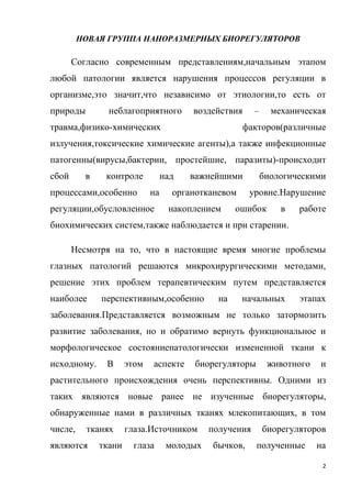 Документ описывает новые глазные бальзамы «виофтаны», основанные на биорегуляторах тканей глаза млекопитающих, которые показывают высокую эффективность в лечении различных глазных заболеваний, особенно на начальных стадиях. Эти бальзамы обладают уникальным механизмом действия, улучшающим не только профилактику, но и восстановление структуры и функции глазной ткани без серьезных побочных эффектов. Применение «виофтанов» может служить важным средством для поддержания здоровья зрения и должно сопровождаться точной диагностикой заболевания.