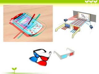 เป็นการฉายภาพ สาหรับตาซ้ายและตาขวาที่มีโทนสีแตกต่างกันลงบนฉากรับ ภาพเดียวกัน โทนสีที่ใช้มักจะใช้เป็นสีแดงและน้าเงิน การ มองด้วยตาเปล่าจะทาให้เห็นเป็นภาพซ้อนและเหลื่อมกันเล็กน้อย การมองภาพ ให้เป็นภาพ3มิติ จึงต้องใช้แว่นที่มีแผ่นกรองแสงด้านหน้ามีข้างหนึ่งเป็นสีแดง และอีกข้างหนึ่งเป็นสีน้าเงิน แว่นนี้ทาหน้าที่ตัดสีที่ตรงกับสีของแว่นออกไป โดยที่แว่นตาข้างที่มีสีแดงจะตัดภาพสีแดงออกไป ทาให้เห็นแต่ภาพที่มีแต่สีน้า เงินส่วนแว่นตาข้างที่เป็นสีน้าเงินจะตัดภาพส่วนที่เป็นสีน้าเงินออกไปทาให้เห็น แต่ภาพที่เป็นสีแดงซึ่งจะทาให้ตาทั้งสองข้างมองเห็นภาพในมุมมองที่แตกต่างกัน ออกไป และสมองจะตีความให้เสมือนว่ามองเห็นภาพเห็นภาพเป็น 3 มิติ