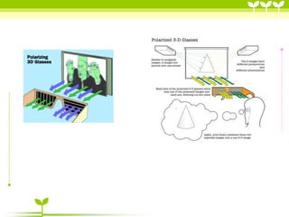 มิติ การแสดงภาพแบบโพลาไรซ์ 3 มิติ (polarized 3-D) มี การทางานที่คล้ายกับแอนากลิฟ โดยการฉายภาพลงที่ฉากรับภาพ เดียวกัน และมีมุมมองของภาพที่แตกต่างกัน แต่เปลี่ยนจากการใช้ สีเป็นตัวตัดภาพไปใช้วิธีการวางตัวของช่องมองภาพแต่ละภาพที่ฉาย ซ้อนกันแทน เช่น แว่นตาข้างซ้ายจะมองเห็นภาพผ่านช่องใน แนวตั้ง ส่วนแว่นข้างขวาจะมองเห็นภาพผ่านช่องในแนวนอน ทาให้ ตาแต่ละข้างมองเห็นภาพไม่เหมือนกัน เมื่อสมองรวมภาพจากตาซ้าย และตาขวาจะมองเห็นภาพเป็น 3 มิติ แว่นตาที่ใช้เป็นแว่นตา โพลาไรซ์สาหรับมองภาพโพลาไรซ์โดยเฉพาะ ซึ่งจะทาให้ภาพมี สีสันสมจริงมากกว่าแบบแอนะกลิฟเทคนิคนี้นิยมใช้ในภาพยนตร์ 3 มิติ