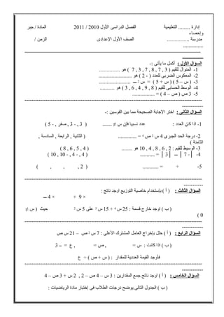 الوثيقة تتعلق بمادة الجبر وتحتوي على مجموعة من الأسئلة الرياضية التي تهدف إلى اختبار معلومات الطلاب في المفاهيم الأساسية كالمعدل، المعكوس، والوسيط. تشمل الأسئلة مسألة تحديد المنوال، والقيام بعمليات حسابية، وتحليل العوامل. كما تتضمن أسئلة تتعلق بتحليل الدرجات في اختبار مادة الرياضيات.