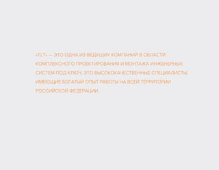 Компания «tlt» является ведущим предприятием в области проектирования и монтажа инженерных систем, основанным в 1997 году в Москве. Специализируется на комплексных работах по внутренним инженерным системам, включая отопление, вентиляцию, электроснабжение и системы безопасности. За время своей деятельности компания реализовала множество крупных проектов в различных регионах России.