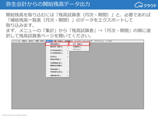 Inc. All Rights Reserved 弥生会計からの開始残高データ出力 開始残高を取り込むには「残高試算表(月次・期間)」と、必要であれば 「補助残高一覧表(月次・期間)」のデータをエクスポートして 取り込みます。 まず、メニューの「集計」から「残高試算表」→「月次・期間」の順に選 択して残高試算表ページを開いてください。