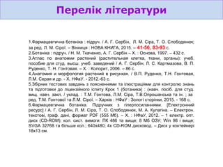 1.Фармацевтична ботаніка: підруч. / А. Г. Сербін, Л. М. Сіра, Т. О. Слободянюк;