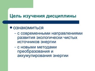 Документ посвящен современным направлениям развития экологически чистых источников энергии и методам преобразования энергии. Рассматриваются проблемы энергетики и окружающей среды, включая влияние различных источников энергии на экологию и здоровье человека. Основное внимание уделяется необходимости разработки и внедрения новых экологически чистых источников электроэнергии и методов ее аккумулирования.
