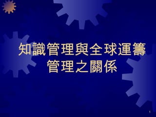 知識管理在全球運籌管理中至關重要,因其能提升企業競爭力並促進可持續發展。文中探討了知識的創造、儲存、擴散和應用,以及文化在知識分享中的影響。成功的知識管理需配合商業策略,並需強力領導支持與相應的硬體及人力架構。