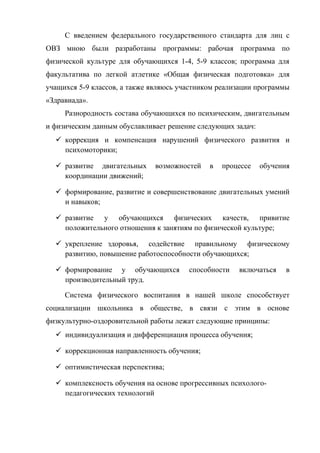 Отчёт описывает педагогическую деятельность Анатолия Ивановича Балашова, учителя физической культуры с 24-летним стажем, работающего в специальной коррекционной школе для детей с ограниченными возможностями здоровья. Основное внимание уделяется формированию здорового образа жизни и социализации учащихся через физическую активность, а также описывается методическая работа и разработанные программы. Документ подчеркивает важность индивидуального подхода к каждому ученику и необходимость создания позитивной среды для успешной интеграции детей в общество.