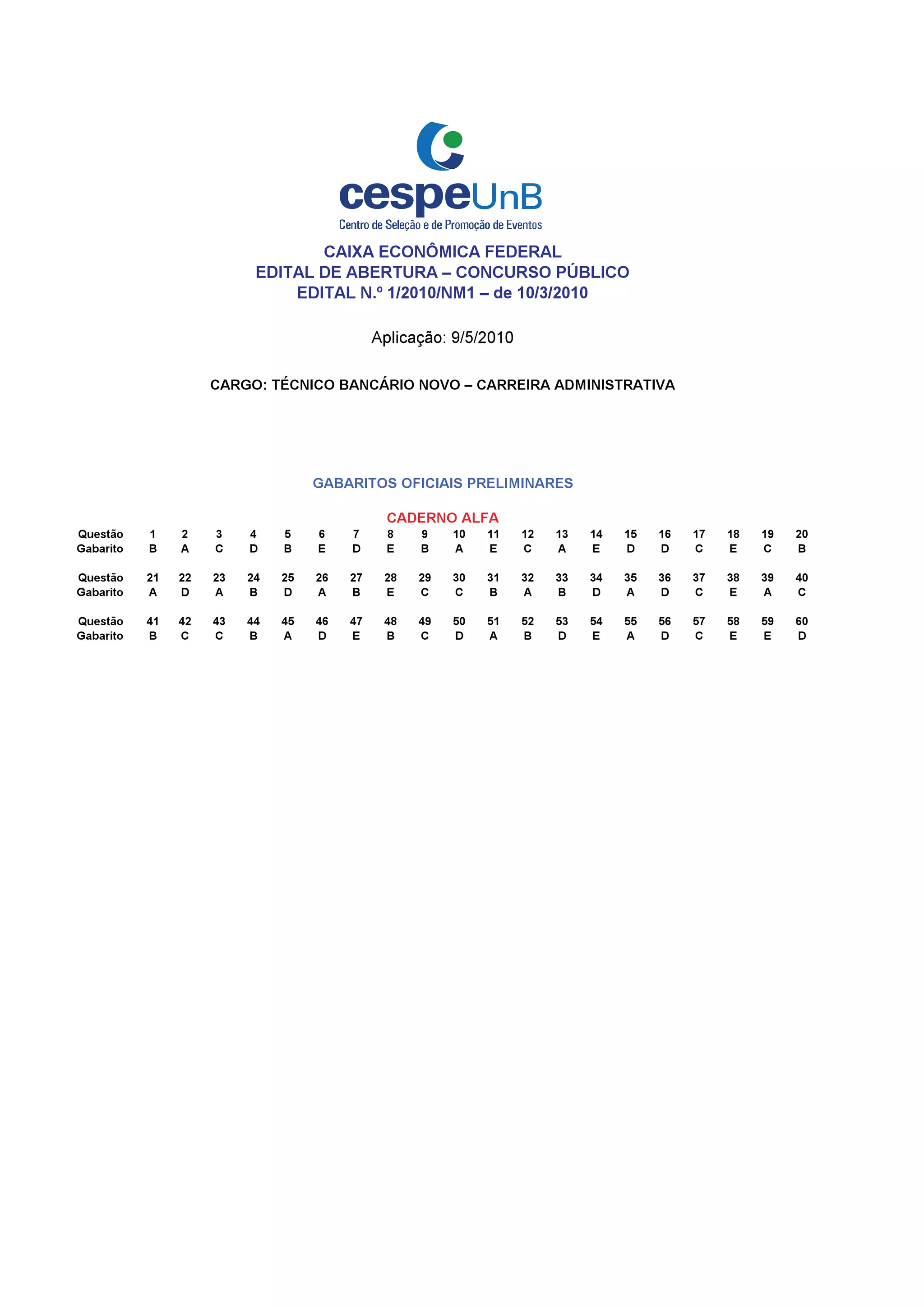 The document announces a public examination for the position of Técnico Bancário Novo in the Administrative Career at Caixa Econômica Federal. It provides the preliminary official answers for the multiple choice questions in Booklet Alpha, with the correct answers labeled with letters A through E. The rest of the document contains blank lines.