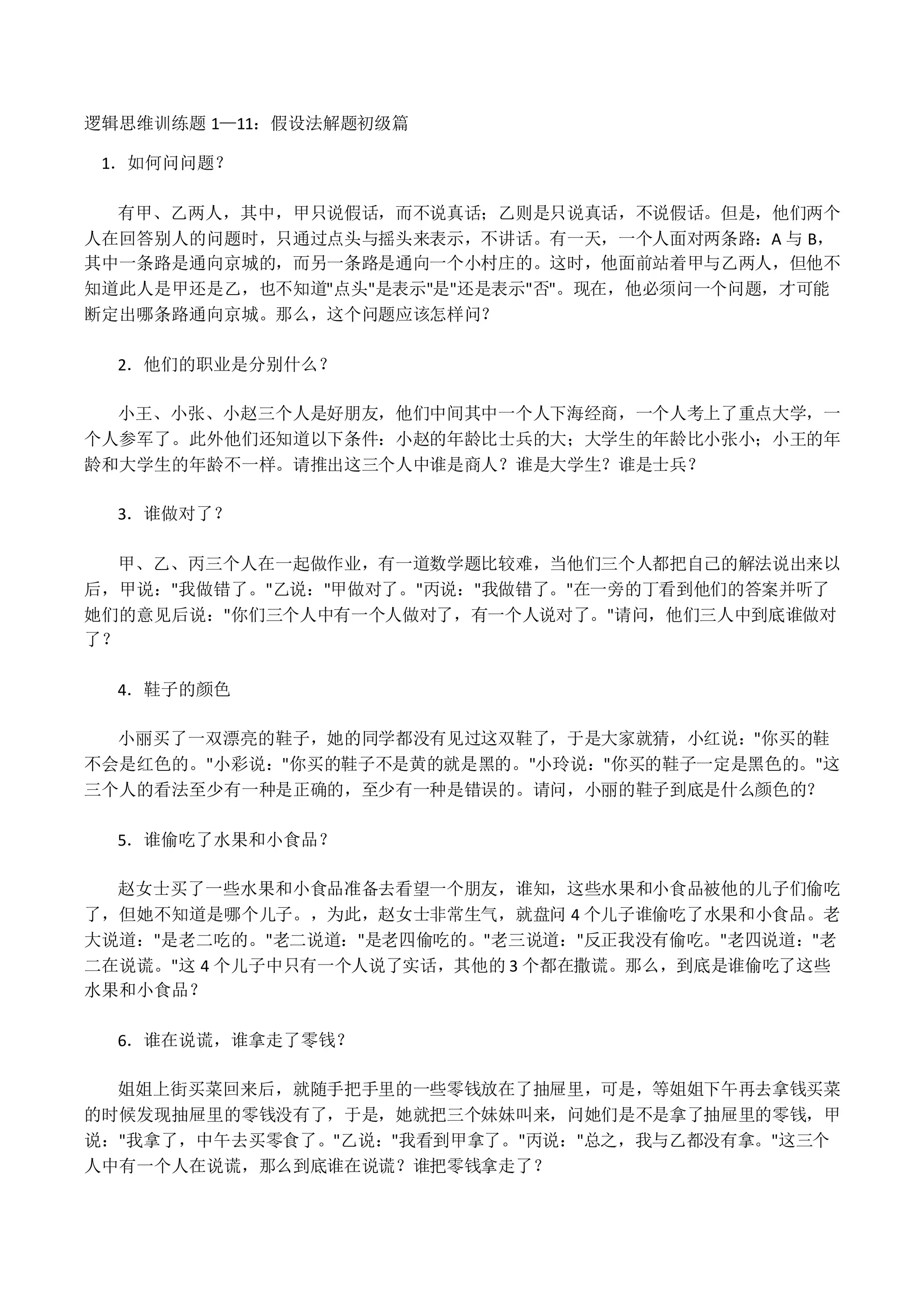 本文提供了一系列逻辑思维训练题,涉及问路、推理人物职业、判断谁说真话等多种推理题目。每个题目都伴随详细的解答过程,使用假设法和推理技巧来得出正确答案。旨在通过这些题目提升读者的逻辑思维能力和问题解决能力。