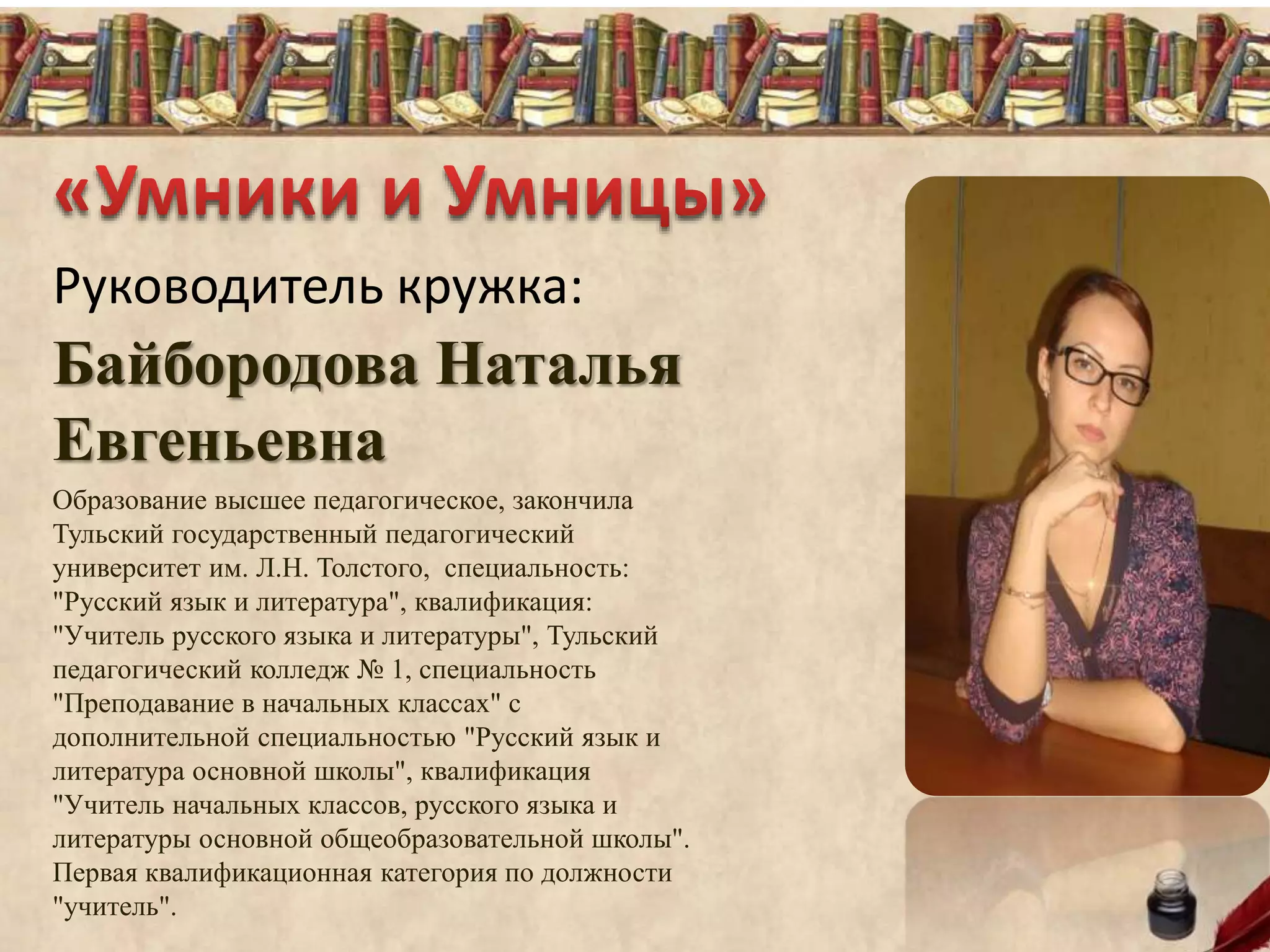 Наталья Евгеньевна Байбородова имеет высшее педагогическое образование и квалификацию учителя русского языка и литературы. Она руководит кружком, целью которого является развитие познавательных способностей учащихся через увлечение русским языком и литературой. Также, она участвовала в олимпиадах, получив несколько дипломов, и проводит занятия по указанному адресу.