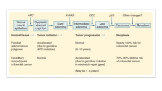 This document discusses potential causes of masses in the right iliac fossa, including appendicular abscess, appendicular mass, ileocecal tuberculosis, and carcinoma of the caecum. It provides characteristics of some common right iliac fossa masses like appendicular masses being tender, soft to firm, and having ill-defined borders, while ileocecal tuberculosis masses are firm to hard and highly placed. The document also reviews colon carcinoma risks such as aging, hereditary factors, and diet high in animal fat or low in fiber, as well as the pathogenesis involving mutations in microsatellite sequences regulating cell growth.