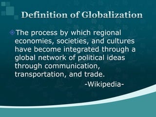 1. Globalization refers to the integration of economies, societies, and cultures through communication, transportation, and trade on a global scale.