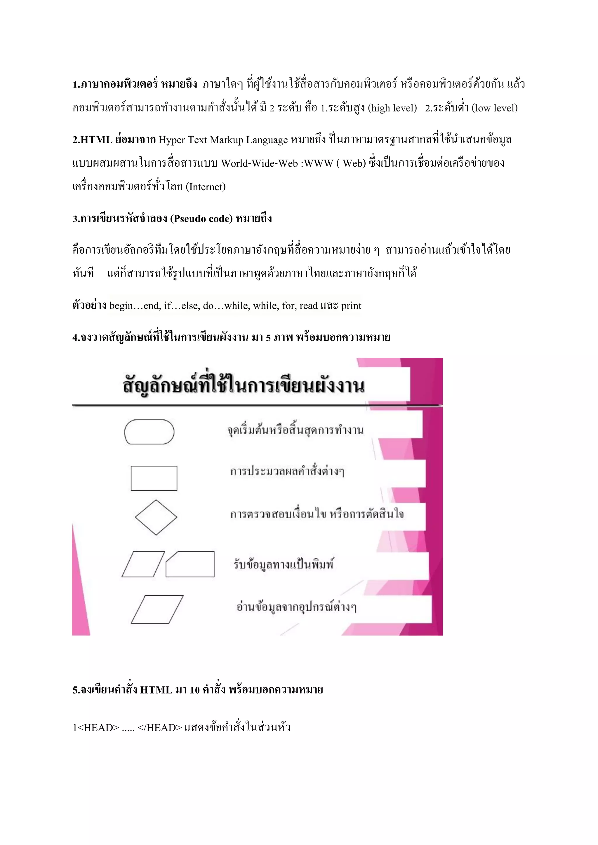 ที่ผู้ใช้งานใช้สื่อสารกับคอมพิวเตอร์ หรือคอมพิวเตอร์ด้วยกัน แล้ว คอมพิวเตอร์สามารถทางานตามคาสั่งนั้นได้มี 2 ระดับ คือ 1.ระดับสูง (high level) 2.ระดับต่า (low level) 2.HTML ย่อมาจาก Hyper Text Markup Language หมายถึง ป็นภาษามาตรฐานสากลที่ใช้นาเสนอข้อมูล แบบผสมผสานในการสื่อสารแบบ World-Wide-Web :WWW ( Web) ซึ่งเป็นการเชื่อมต่อเครือข่ายของ เครื่องคอมพิวเตอร์ทั่วโลก (Internet) 3.การเขียนรหัสจาลอง (Pseudo code) หมายถึง คือการเขียนอัลกอริทึมโดยใช้ประโยคภาษาอังกฤษที่สื่อความหมายง่าย ๆ สามารถอ่านแล้วเข้าใจได้โดย ทันที แต่ก็สามารถใช้รูปแบบที่เป็นภาษาพูดด้วยภาษาไทยและภาษาอังกฤษก็ได้ ตัวอย่าง begin…end, if…else, do…while, while, for, read และ print 4.จงวาดสัญลักษณ์ที่ใช้ในการเขียนผังงาน มา 5 ภาพ พร้อมบอกความหมาย 5.จงเขียนคาสั่ง HTML มา 10 คาสั่ง พร้อมบอกความหมาย 1<HEAD> ..... </HEAD> แสดงข้อคาสั่งในส่วนหัว